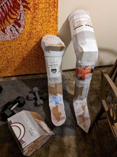 I finished the flower top. I hot-glued all the petals at the top together from their bottoms to make it spiky like a pistil. I paper-mached the gaps in-between the gaps and seams of the cardboards in the legs. I also began the arms and hands. The hands were difficult to proportion, but they came out well. I gave them pointed nails like thorns and used small strips of cardboard and glued and pinched the sides to make them bend into segments and curl around.